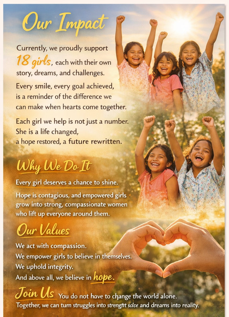 To empower girls through education, care, and opportunity, creating stronger communities and brighter futures filled with hope and dignity. 💛